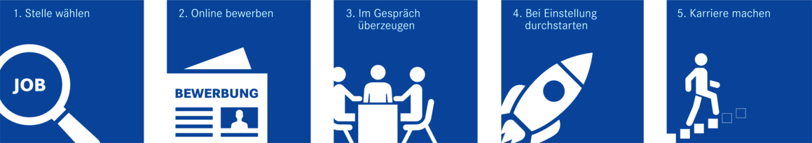 Bewerben Sie sich online. Das spart Zeit, Geld und stellt sicher, dass Ihre Bewerbung garantiert an Ihren Ansprechpartner gelangt. Bereiten Sie Ihre Bewerbungsunterlagen – ausführlichen Lebenslauf und Zeugnisse sowie Bescheinigungen und Zertifikate – vor und folgen Sie einfach unserem Online-Bewerbungsprozess. Wir führen Sie gut durch. Und wenn alles passt, sehen wir uns. Bald.