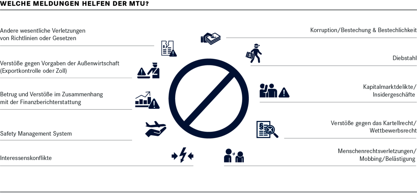 Integrität beginnt, wenn man aus eigener Überzeugung das Richtige tut – und zwar besonders dann, wenn Andere dies nicht tun. Also haben Sie den Mut, uns zu kontaktieren! Wir haben bei der MTU Meldewege für unrechtmäßiges Verhalten eingerichtet, über die nicht nur die Mitarbeiter:innen, sondern auch Externe auffällige Sachverhalte melden oder auf Missstände aufmerksam machen können.
