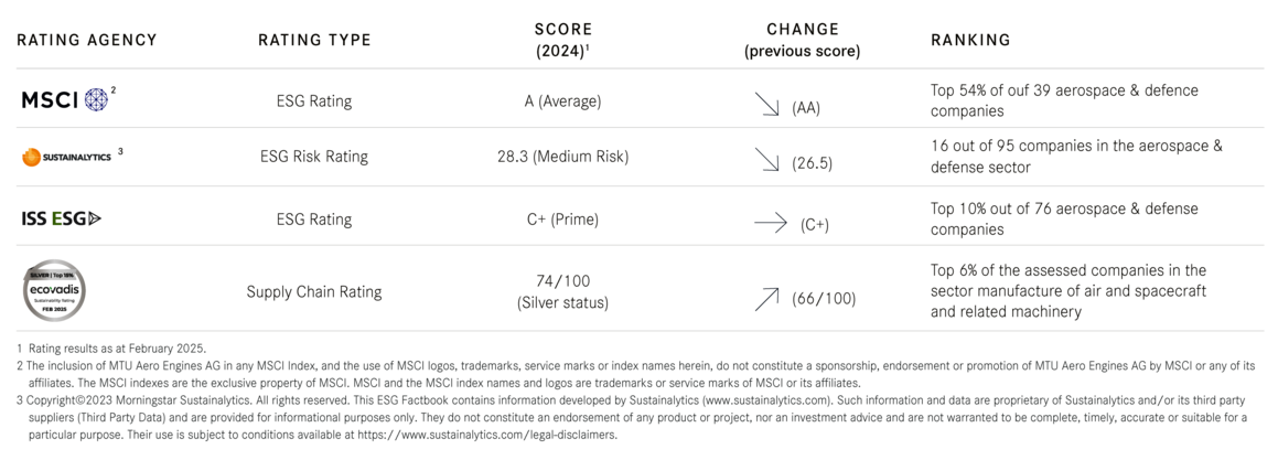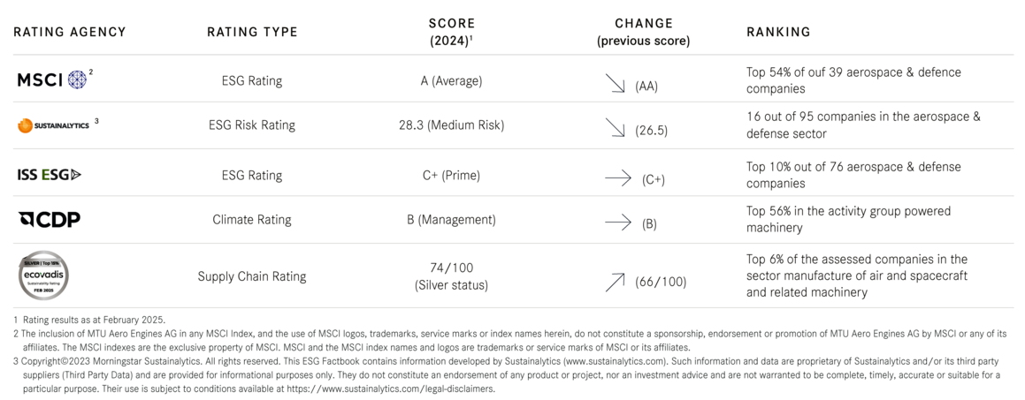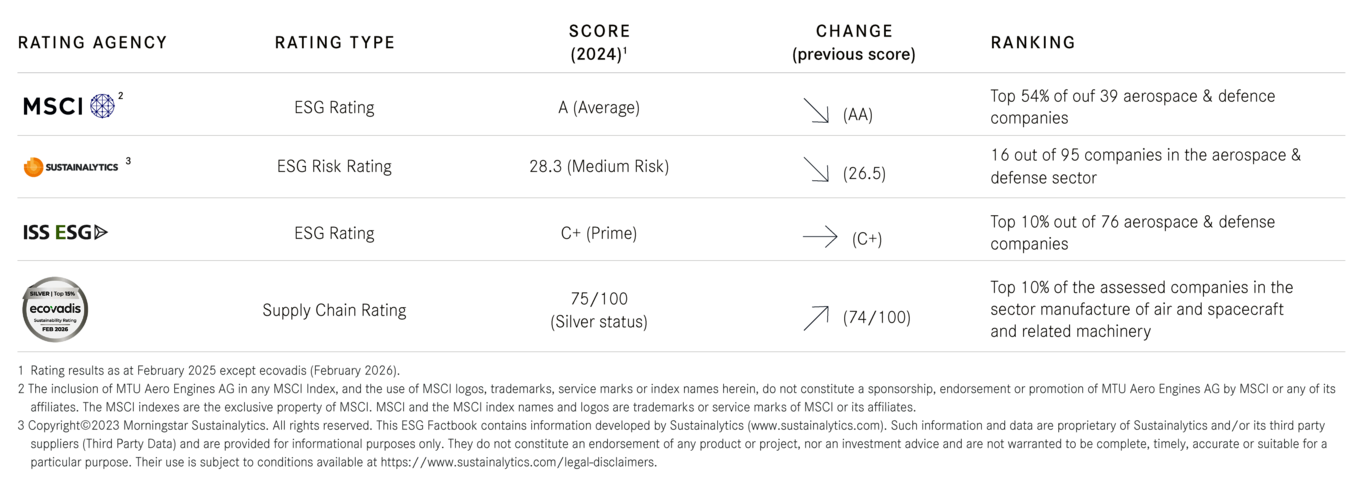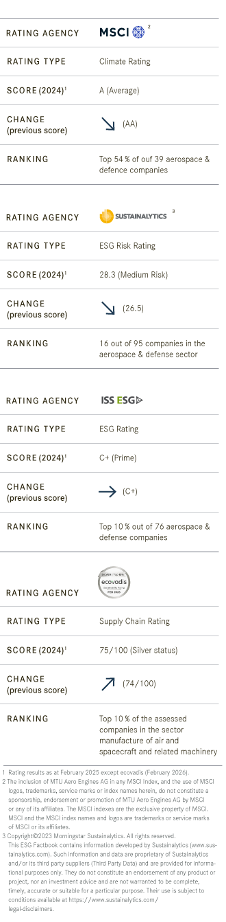 We’re continuously developing our reporting on environmental and sustainability issues in line with nationally and internationally recognized reporting standards. The Group Sustainability Statement in the MTU Annual Report is supplemented by an ESG Factbook and topic-specific publications on sustainability performance. Our policies and principles are based on internationally recognized standards in the area of sustainability and human rights.